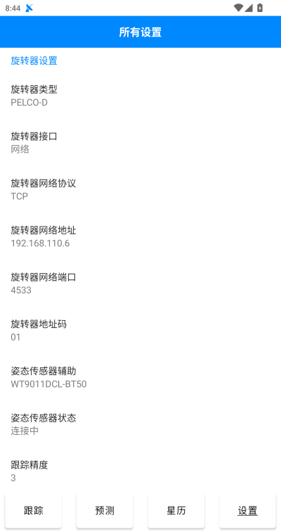 - 在DTrac APP设置里旋转器设置选项界面,旋转器类型选择PELCO-D,这里旋转器地址和端口与串口服务器保持一致,设置好旋转器的参数后,与旋转器保持在同一网络,然后连接旋转器;