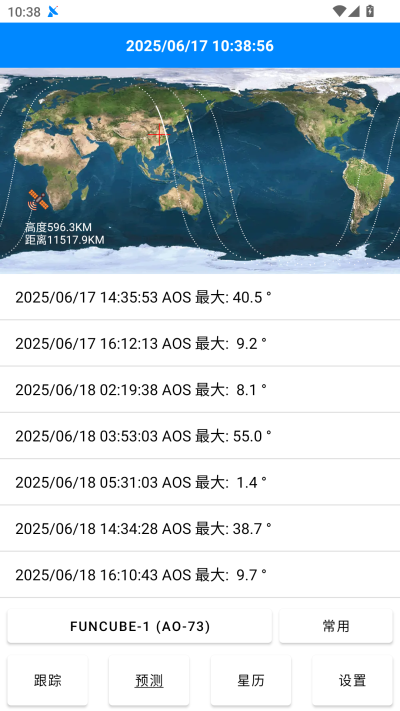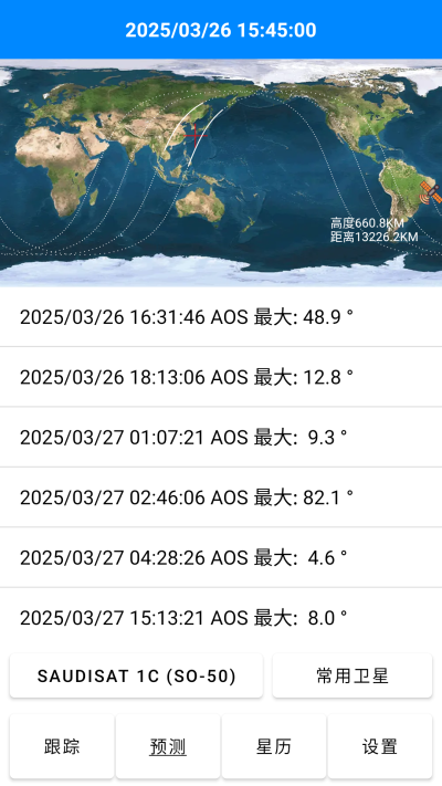预测界面提供单星预测和常用卫星预测两种预测功能。最新版本卫星预测采用与著名业余无线电软件look4sat相同的类库: predict4java, 预测精度可以保证。点击顶部标签栏,可以开关单星预测轨迹图是否跟随显示卫星高度和距离等数据。