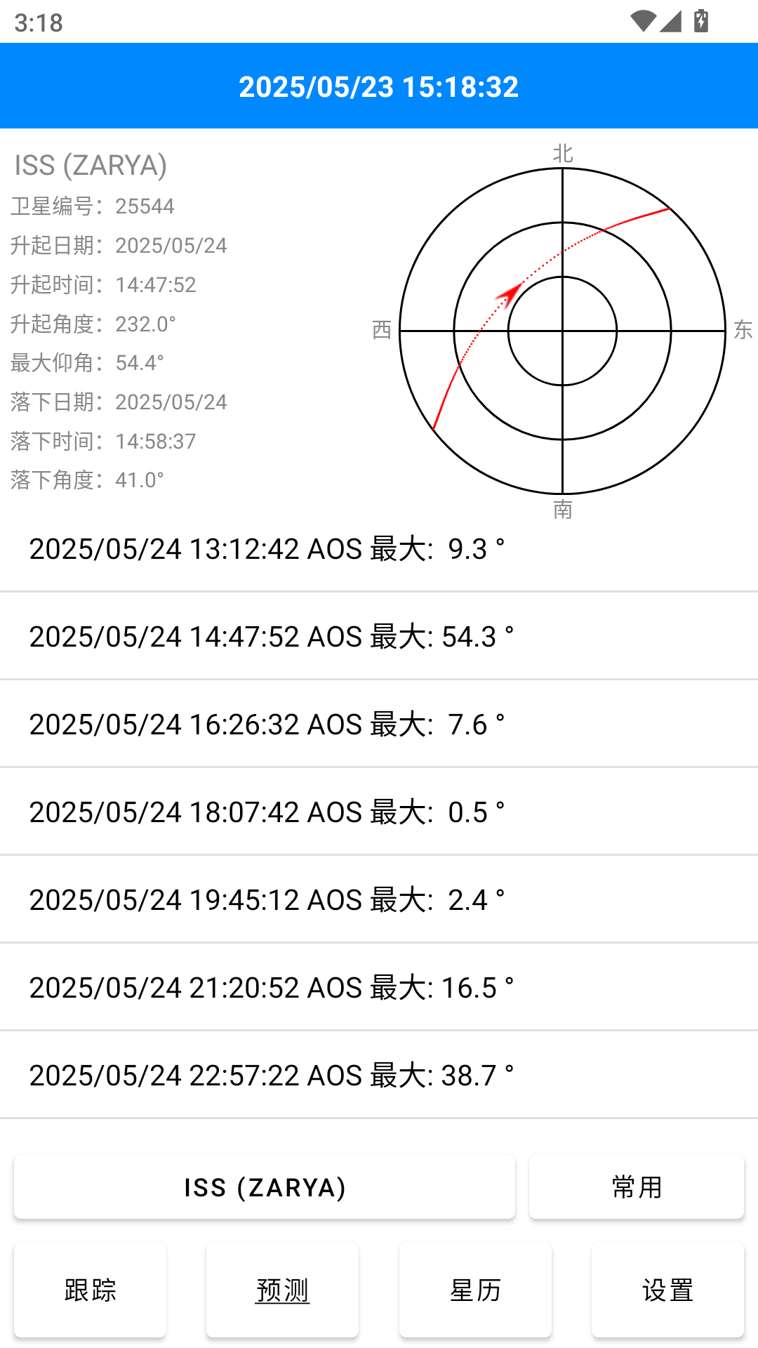 常用卫星预测,提供个人收藏的常用卫星的预测结果,分别分两行显示,第一行显示入境时间、下行模式,第二行显示卫星编号、卫星名称和最大仰角。点击预测结果列表项目,会快捷跳转到对应卫星的单星预测界面;