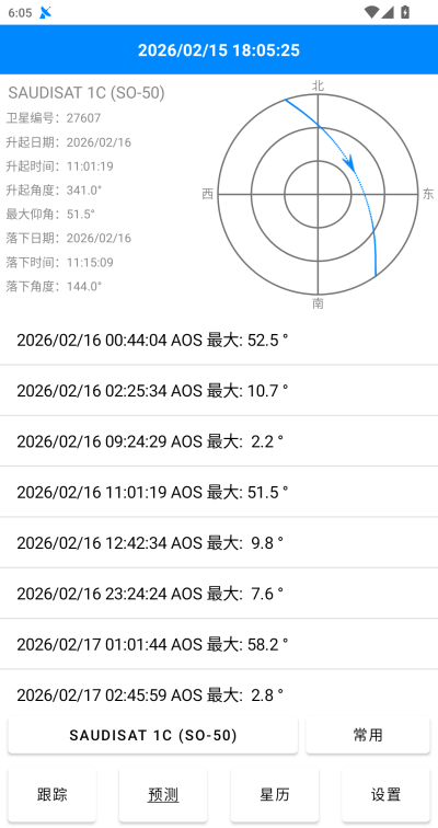 常用卫星预测,提供个人收藏的常用卫星的预测结果,分别分两行显示,第一行显示入境时间、下行模式,第二行显示卫星编号、卫星名称和最大仰角。单击预测结果列表项目,会快捷跳转到对应卫星的单星预测界面;