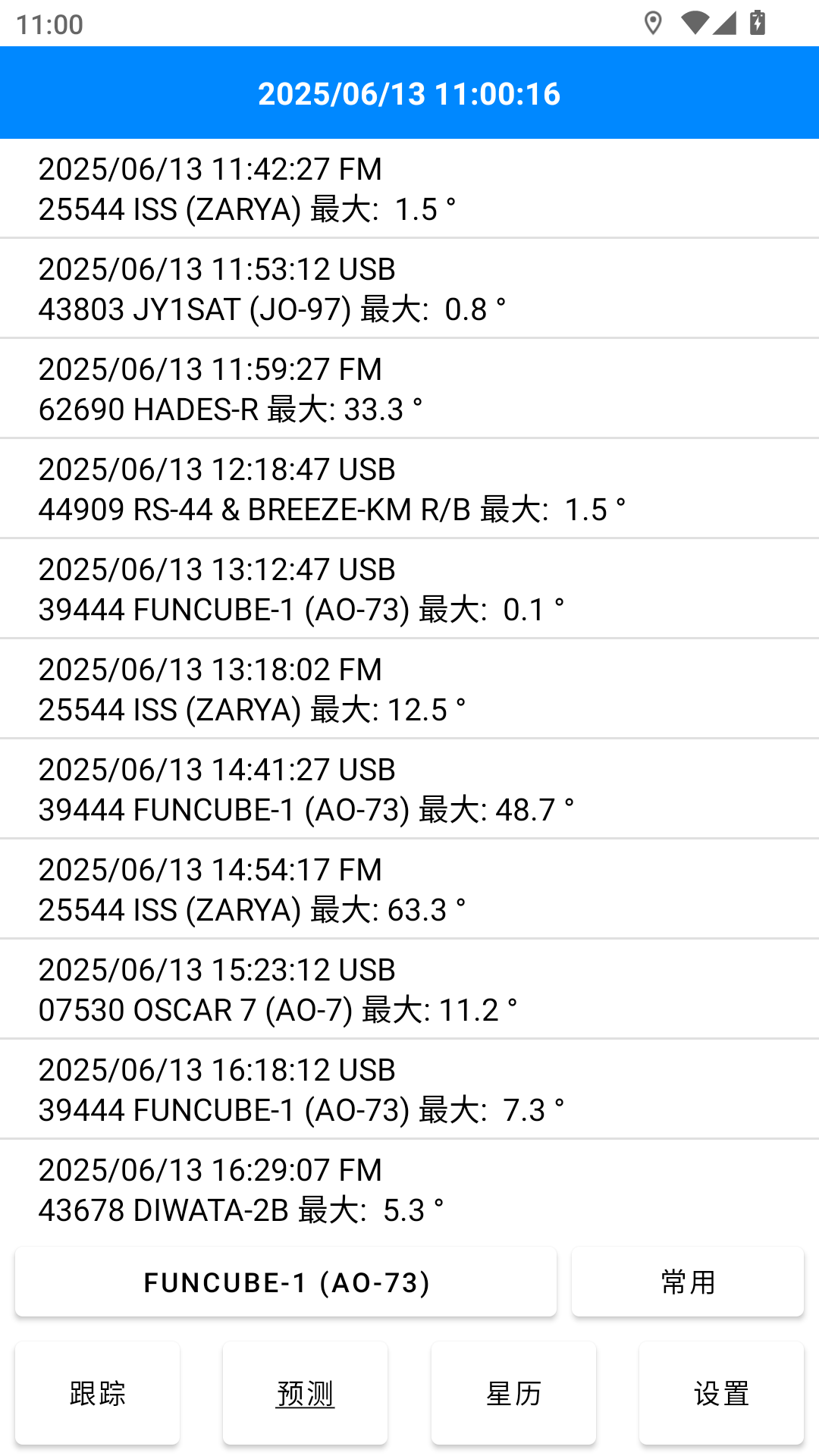 APP每次启动时会自动更新一次业余卫星星历,其他类别的星历需要手动点击更新。