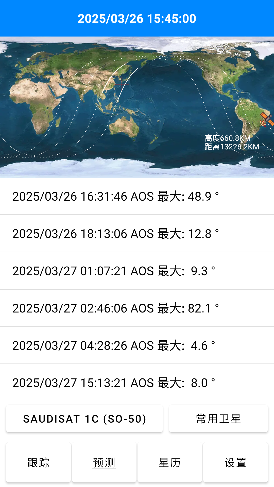预测界面提供单星预测和常用卫星预测两种预测功能。最新版本卫星预测采用与著名业余无线电软件look4sat相同的类库:predict4java,预测精度可以保证。点击顶部标签栏,可以开关单星预测轨迹图是否跟随显示卫星高度和距离等数据。
