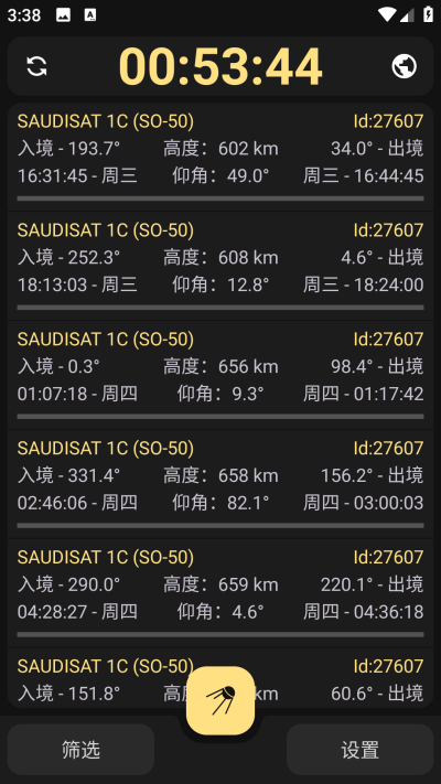 常用卫星预测列表中灰色字体显示代表卫星已离境,红色代表已入境,蓝色代表半小时内即将入境。