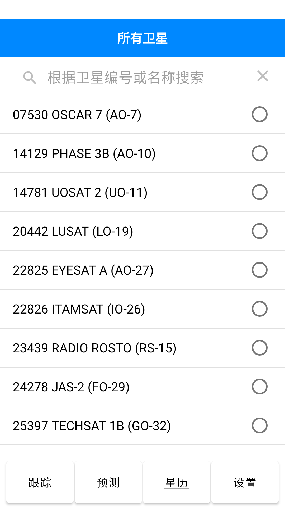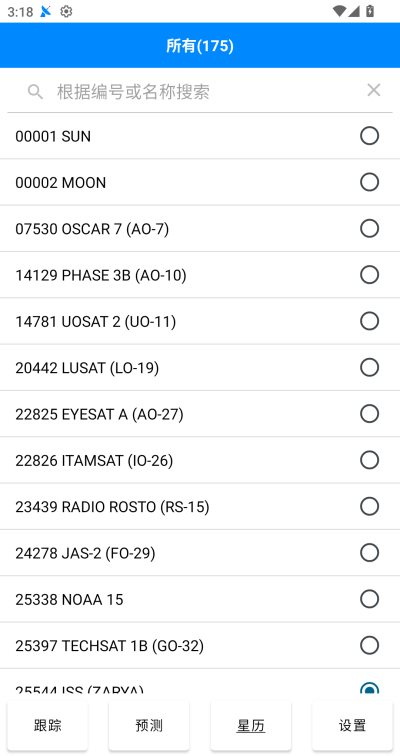 单击星历列表项目可以打开卫星应答器参数维护界面,长按星历列表项目会快捷跳转到对应卫星的单星跟踪界面。