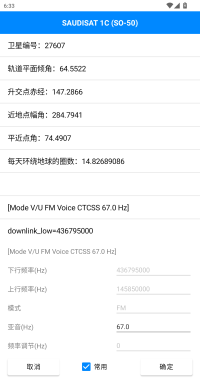 在该界面,可以将当前卫星加入常用卫星列表,点击常用单选框选中并点击确定按钮后保存。