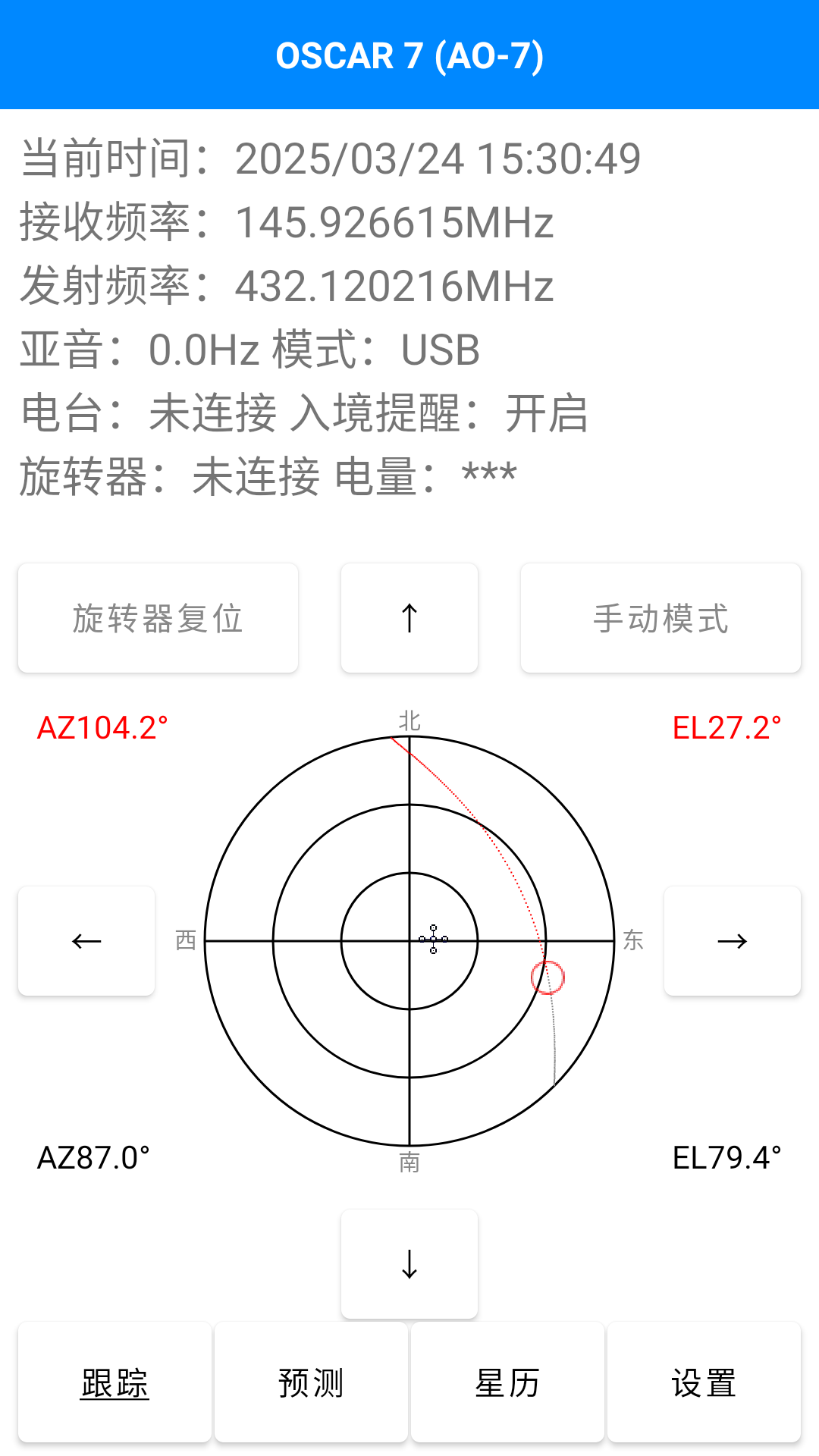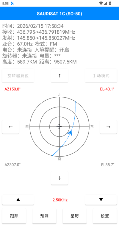 跟踪界面主要负责控制旋转器(天线)指向目标卫星和同步电台的通联参数,来达到便捷通联业余卫星的目的。该界面提供当前时间、多普勒频率、亚音、模式、旋转器状态、电台状态,以及卫星状态的参数展示,支持手动对星操作、卫星入境提醒等,支持实时显示旋转器(天线)姿态角。