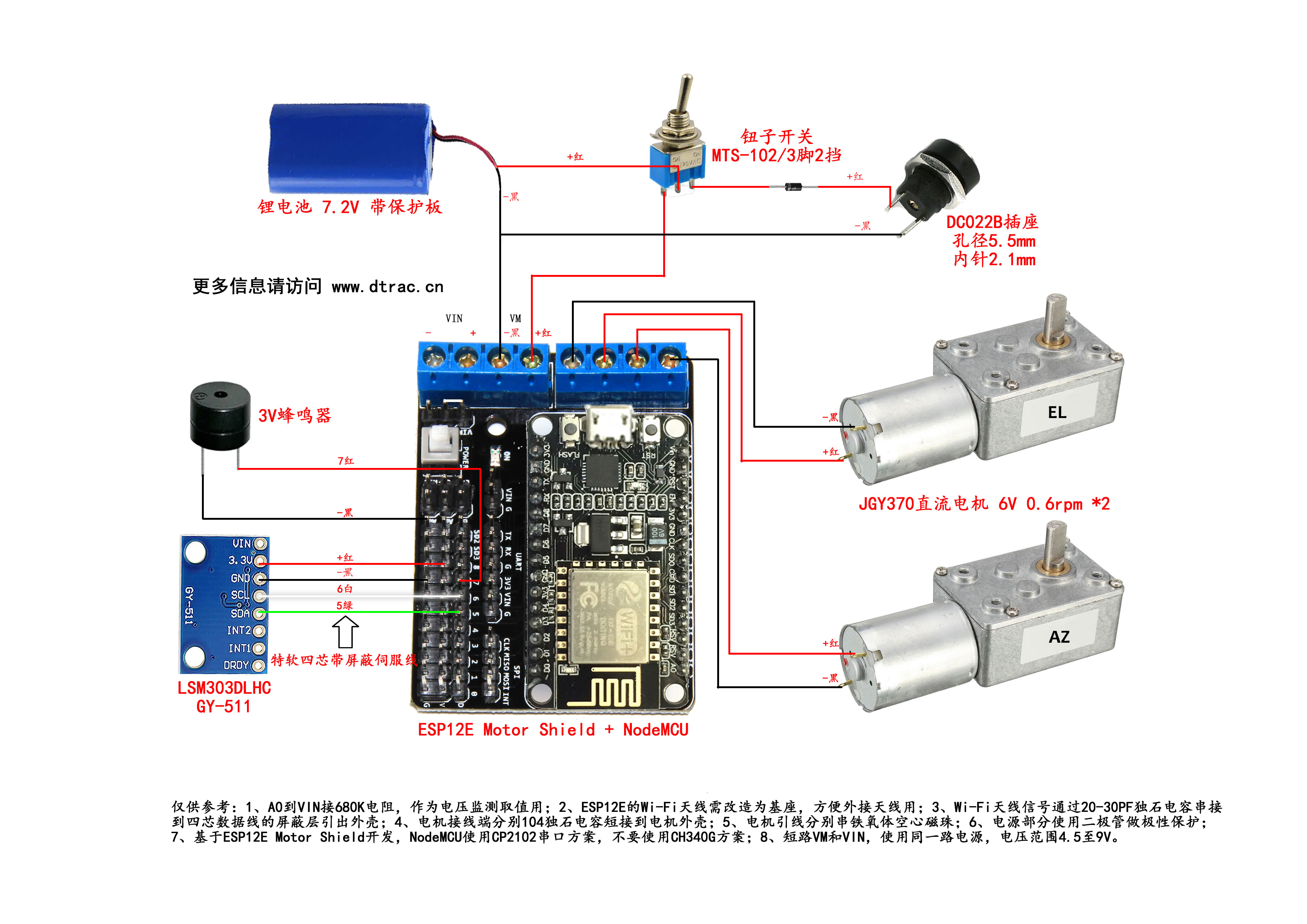 最新的Wi-Fi版的DTrac Rotor V1 核心采用一个ESP8266模块进行控制,定制的固件可实现以下功能: