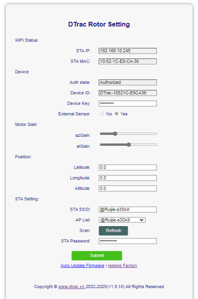 - 在浏览器输入 http://192.168.4.1 ,访问DTrac Rotor V1 配置页面,在这个页面底部设置“STA Setting”参数“STA SSID”、“STA Password”分别对应您的无线路由器的Wi-Fi设置,点击“submit”提交保存设置,Rotor重启后,“WiFi Status”处如果获取到IP,表示Rotor成功连接互联网;