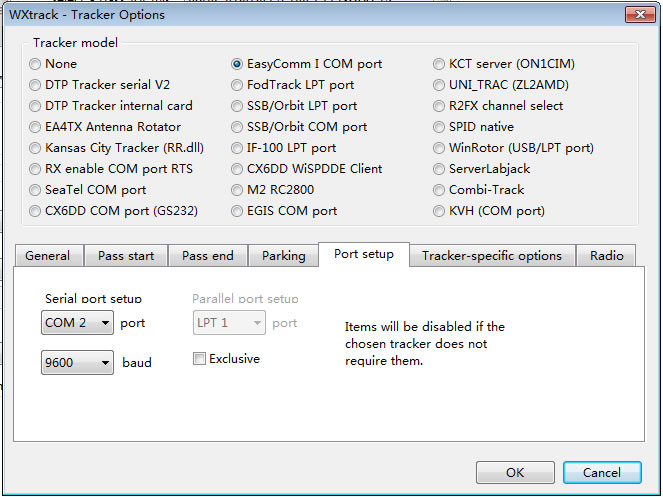 Tracker model : EasyComm I COM port,端口号选择第2步自定义的虚拟端口号。